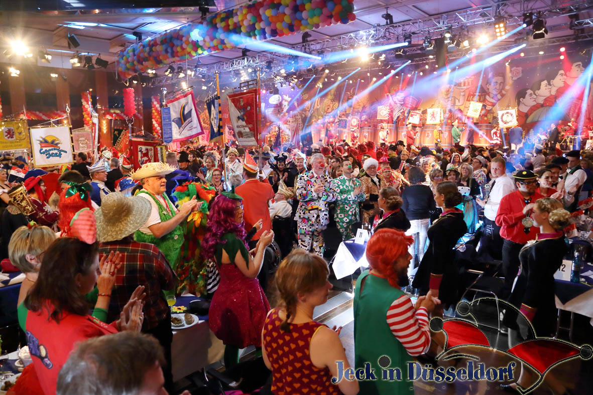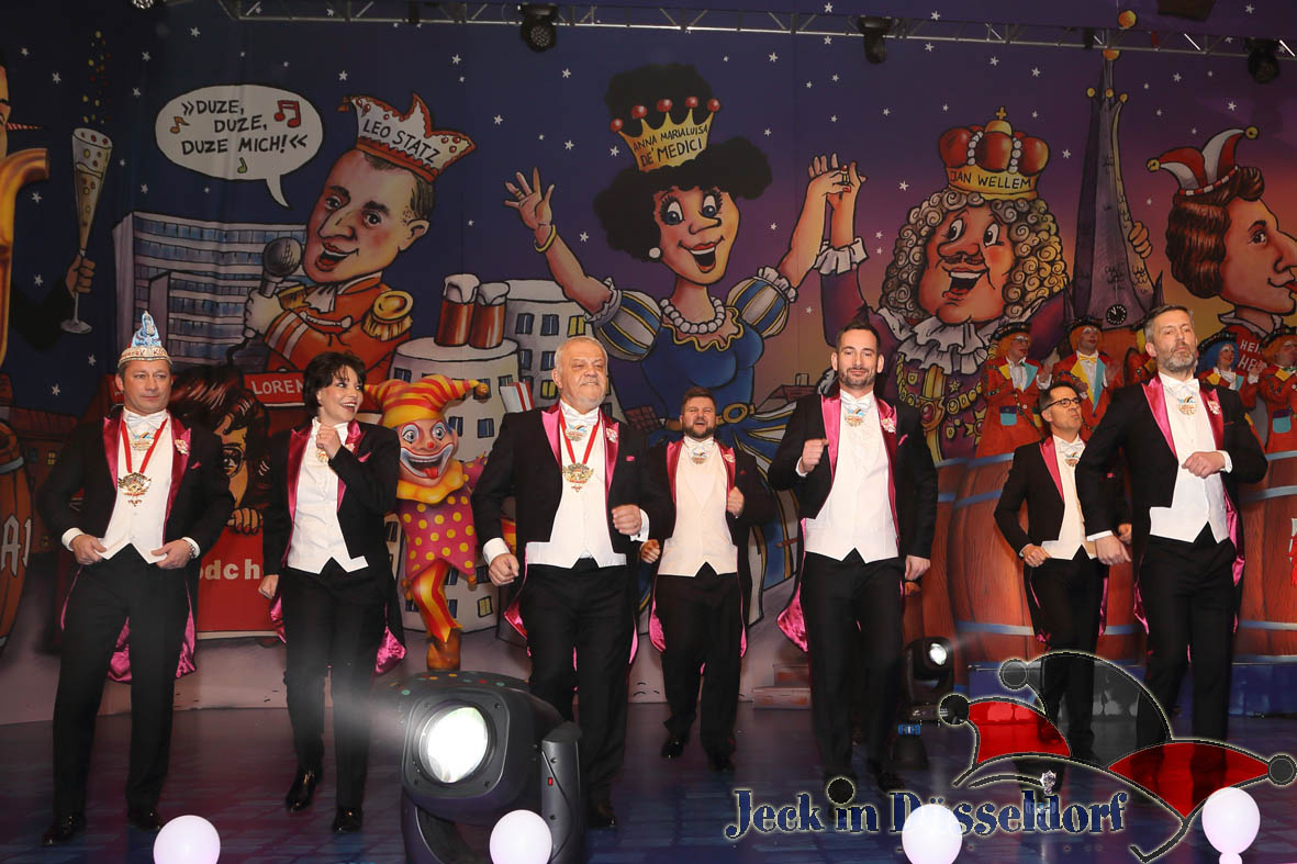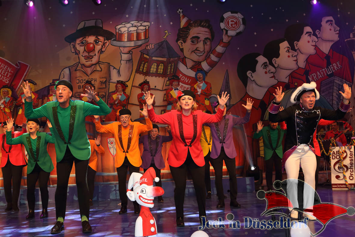 Beim Betreten des Saals fällt sofort das neue, farbenfrohe Bühnenbild ins Auge, das von keinem anderen als Jacques Tilly erschaffen wurde. Auf stolzen 45 Meter Breite und sieben Meter Höhe prangen nun anstelle der in die Jahre gekommenen Stadtansichten Düsseldorfer Persönlichkeiten. Campino und Heino geben das Prinzenpaar, dazu gesellen sich Toni Turek Fußballgott, Joseph Beuys, Kraftwerk und viele weitere bekannte Gesichter. Dazwischen stehen die baulichen Wahrzeichen der Landeshauptstadt, unter anderem die Gehry-Bauten, der Fernsehturm und natürlich "Schlossturm und Lambätes".
