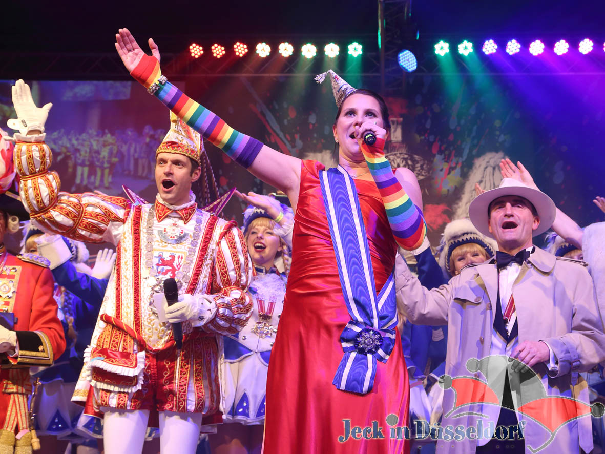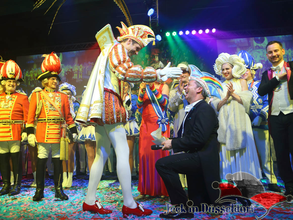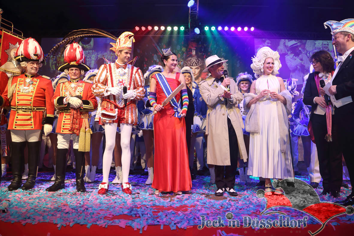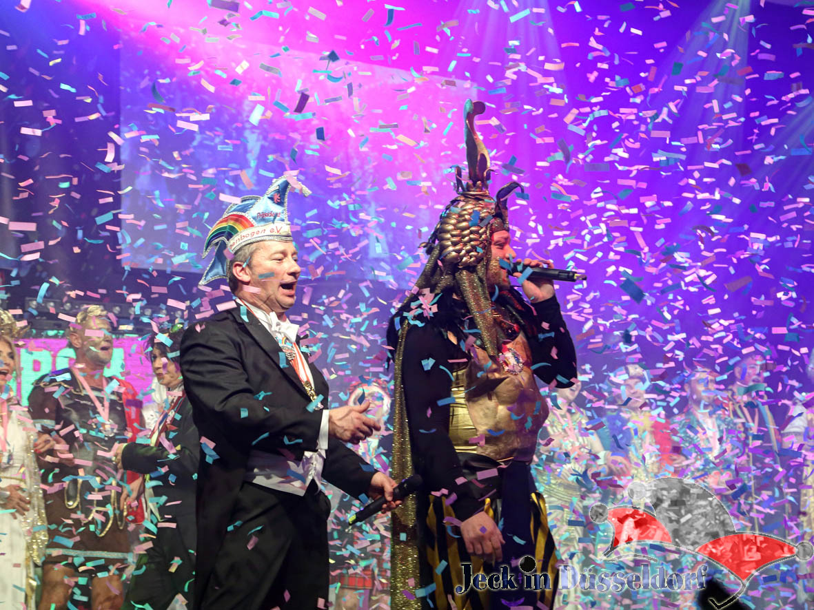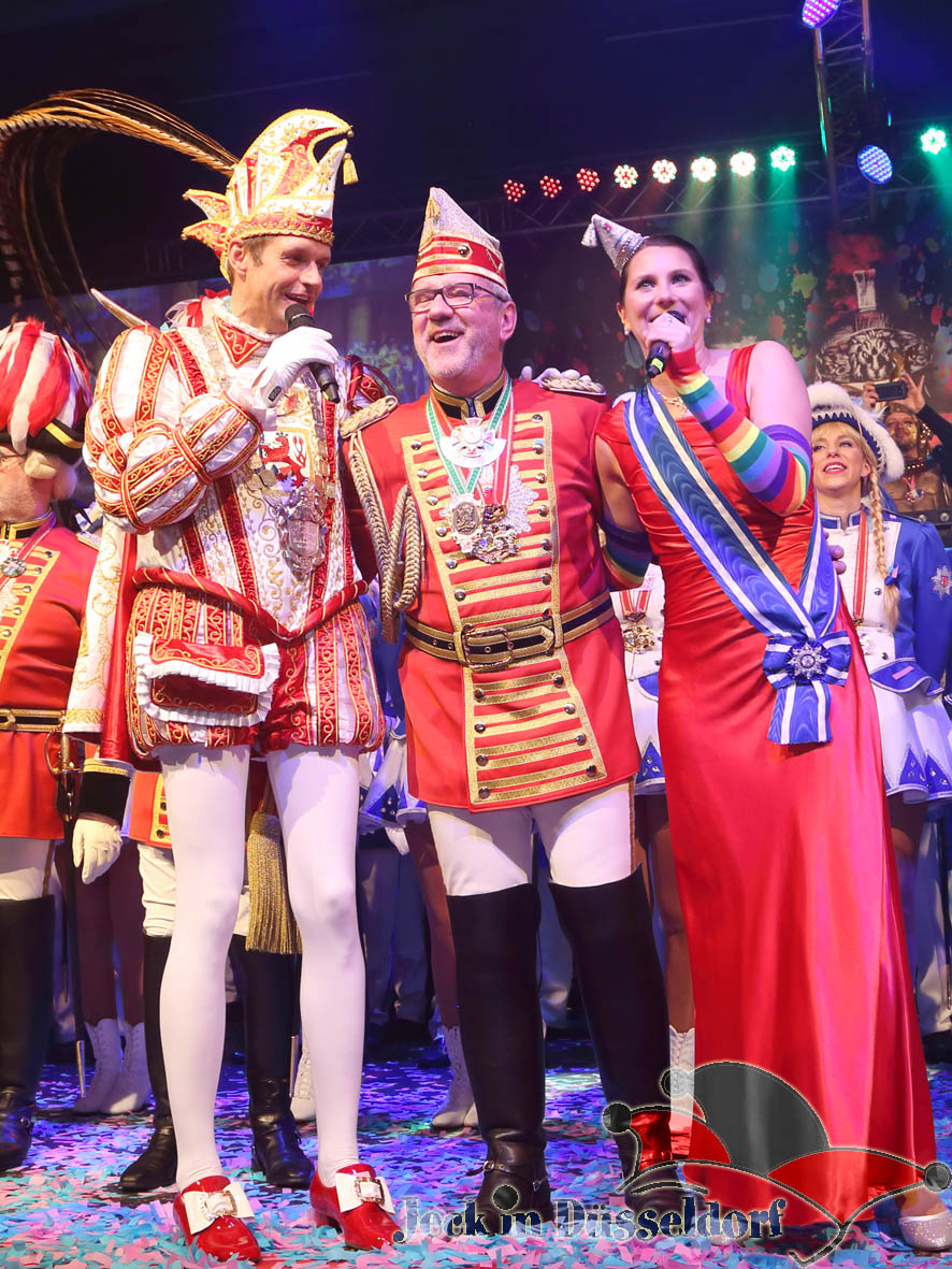 Unter dem Jubel der Gäste und einem Konfettisturm zieht gegen Mitternacht das Düsseldorfer Prinzenpaar in Begleitung der Prinzengarde Blau-Weiss auf die Bühne.
