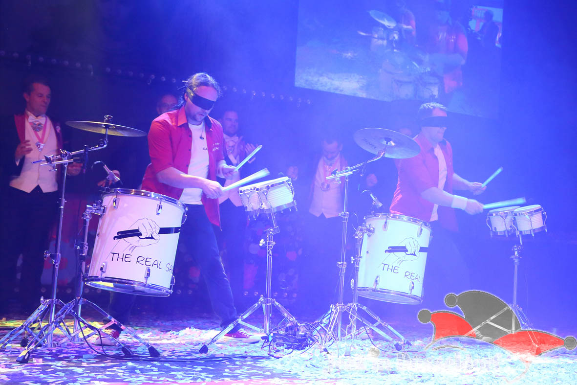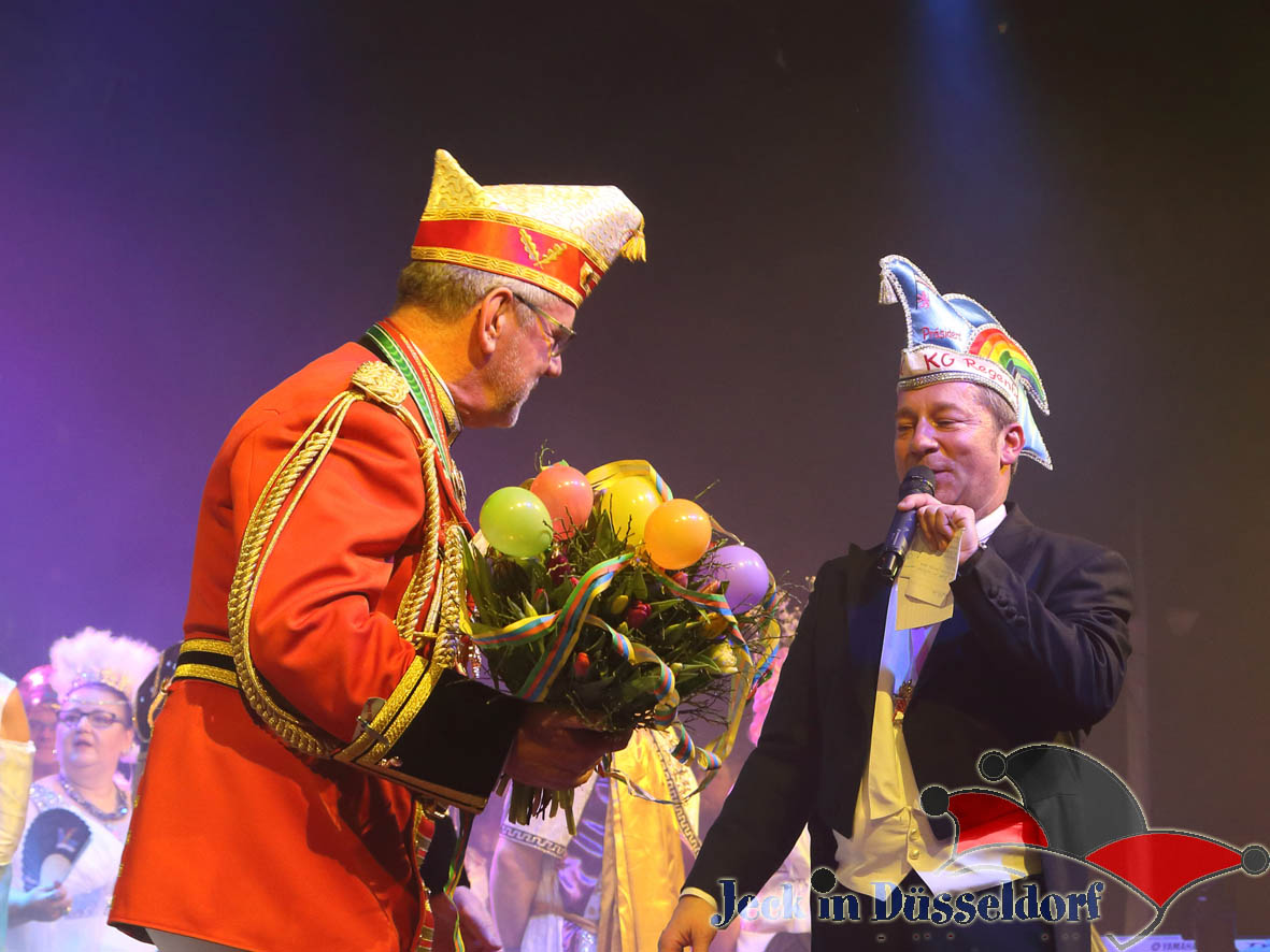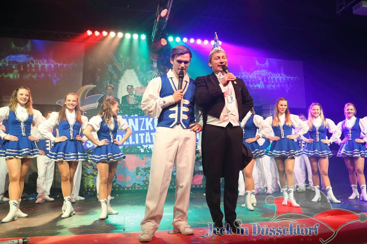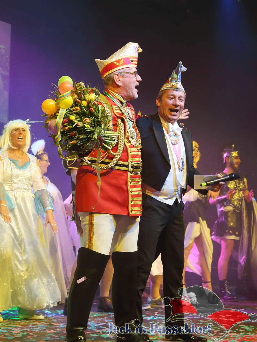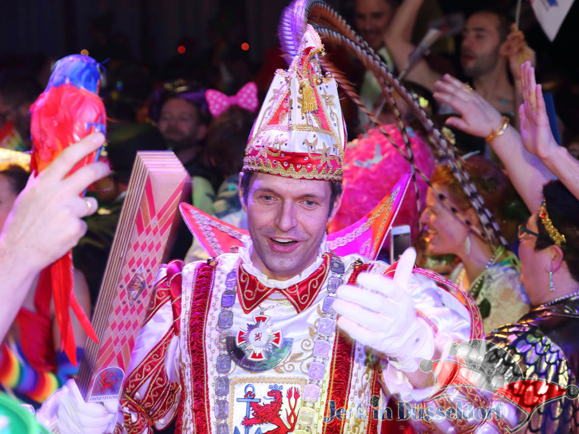 Unter dem Jubel der Gäste und einem Konfettisturm zieht gegen Mitternacht das Düsseldorfer Prinzenpaar in Begleitung der Prinzengarde Blau-Weiss auf die Bühne.