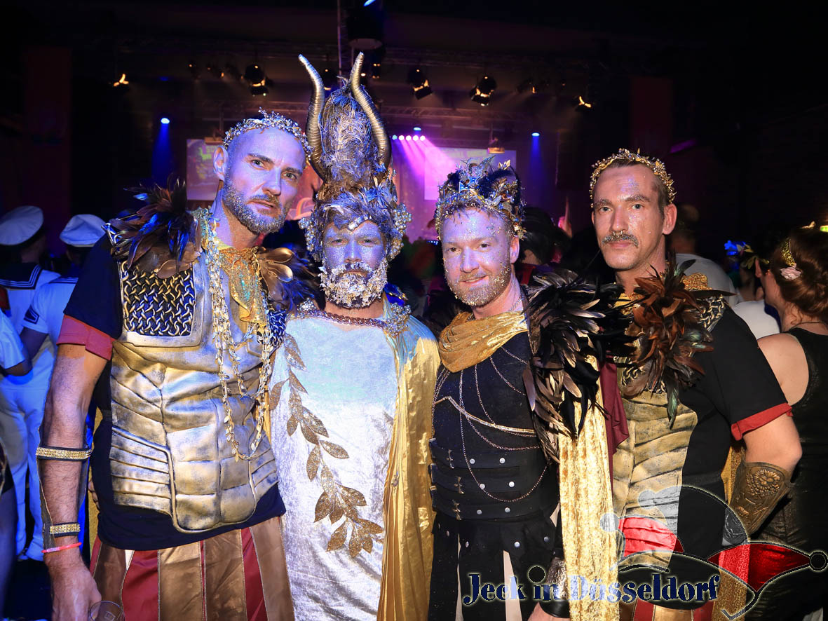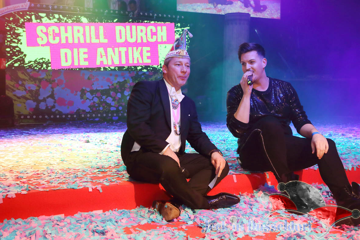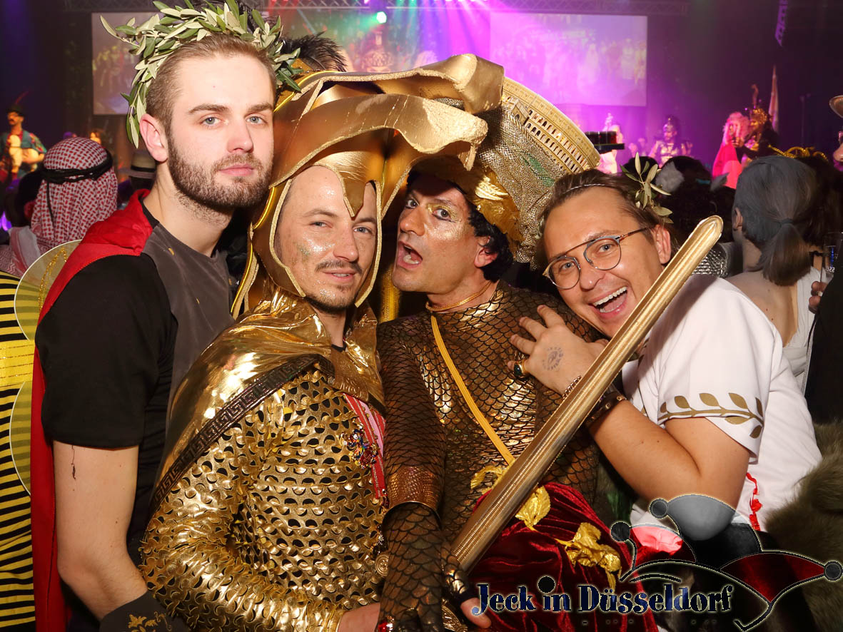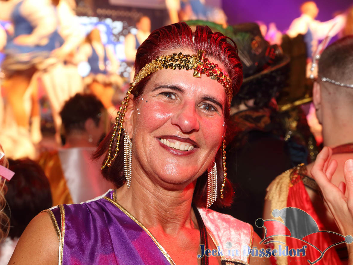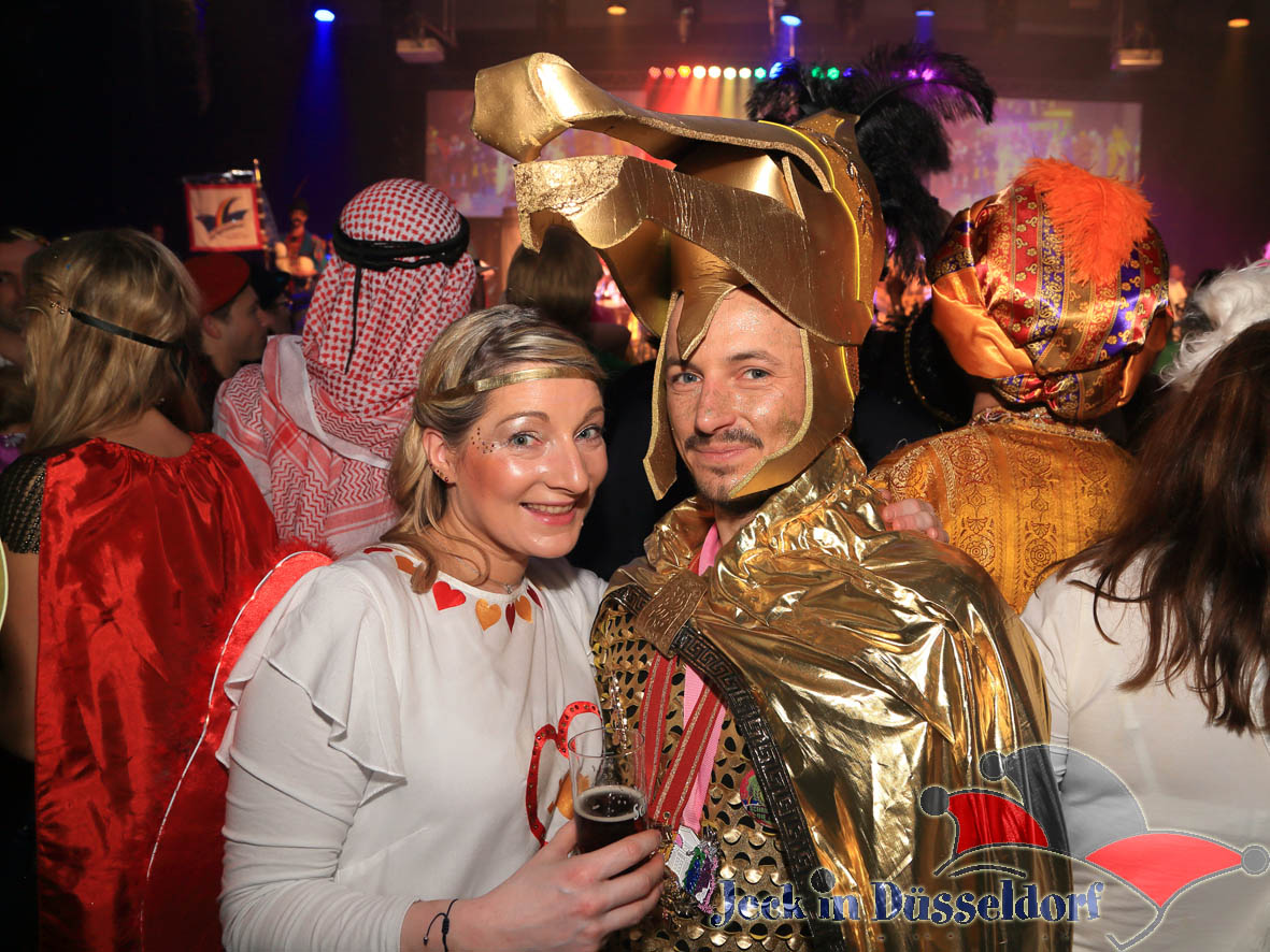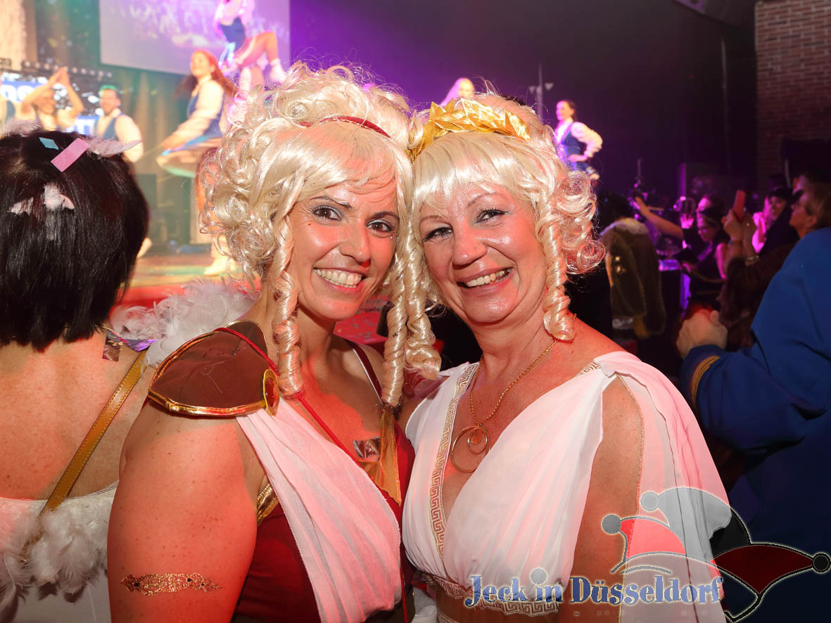 "Schrill durch die Antike" - so lautet das diesjährige Sessionsmotto der KG Regenbogen. Diesem Motto entsprechend kostümiert kommen zahlreiche der über 1.300 Gäste am Samstagabend ins Stahlwerk zur Sitzungsparty. So treffen Götter und Göttinnen auf alte Griechen, Ägypter und Römer, und wie immer bei dieser Veranstaltung sind äußerst fantasievolle und aufwändig gestaltete Kostüme dabei.