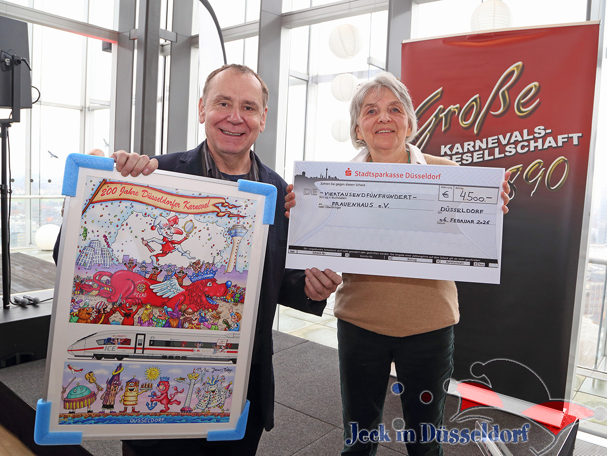 Im vergangenen Jahr taufte die Deutsche Bahn ihren neuen ICE 3neo auf den Namen „Düsseldorf“ und ließ ihn mit Motiven des Wagenbauers Jacques Tilly gestalten. Die GROẞE KG bot die Entwürfe anschließend als hochwertig gerahmte Collagen zum Verkauf an – streng limitiert auf 50 Exemplare und handsigniert von Tilly. Der komplette Erlös kommt dem Frauenhaus Düsseldorf zugute. Heute wird der entsprechende Scheck überreicht.