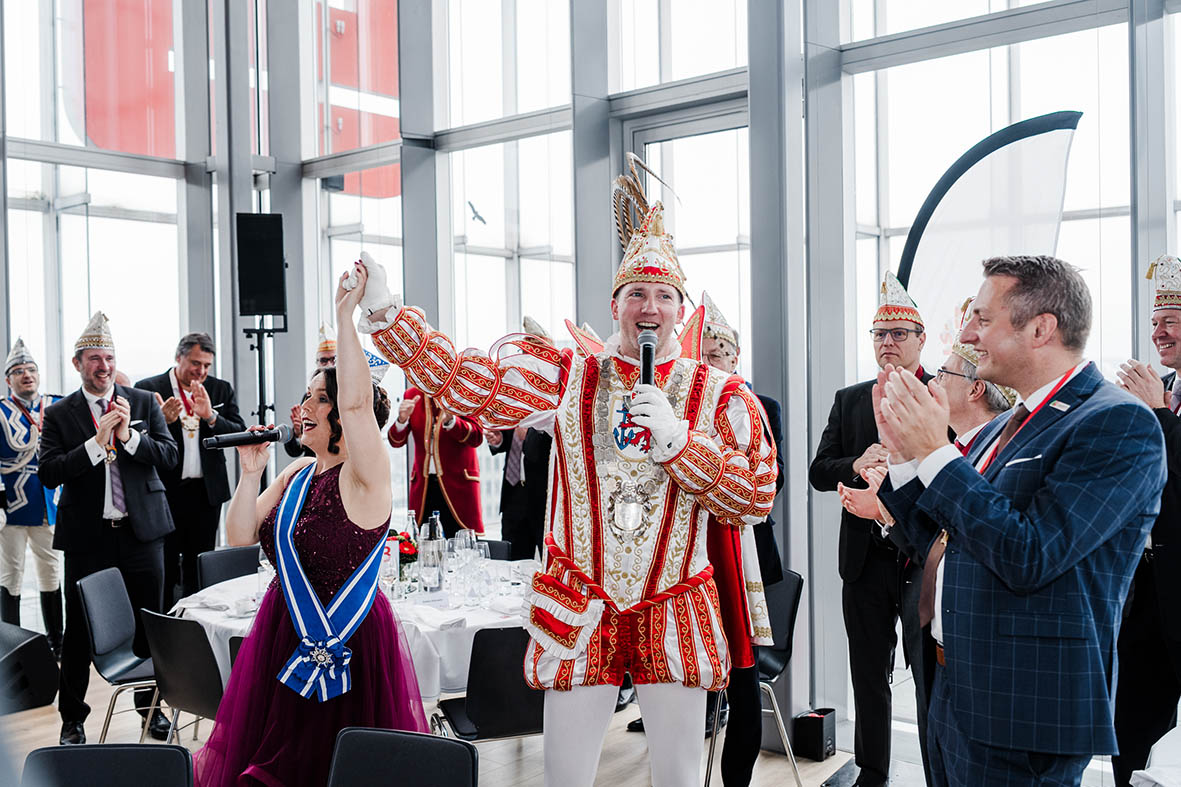 Die Gäste machen mit, als das Düsseldorfer Prinzenpaar sein Sessionslied präsentiert (Foto: Heike Katthagen).